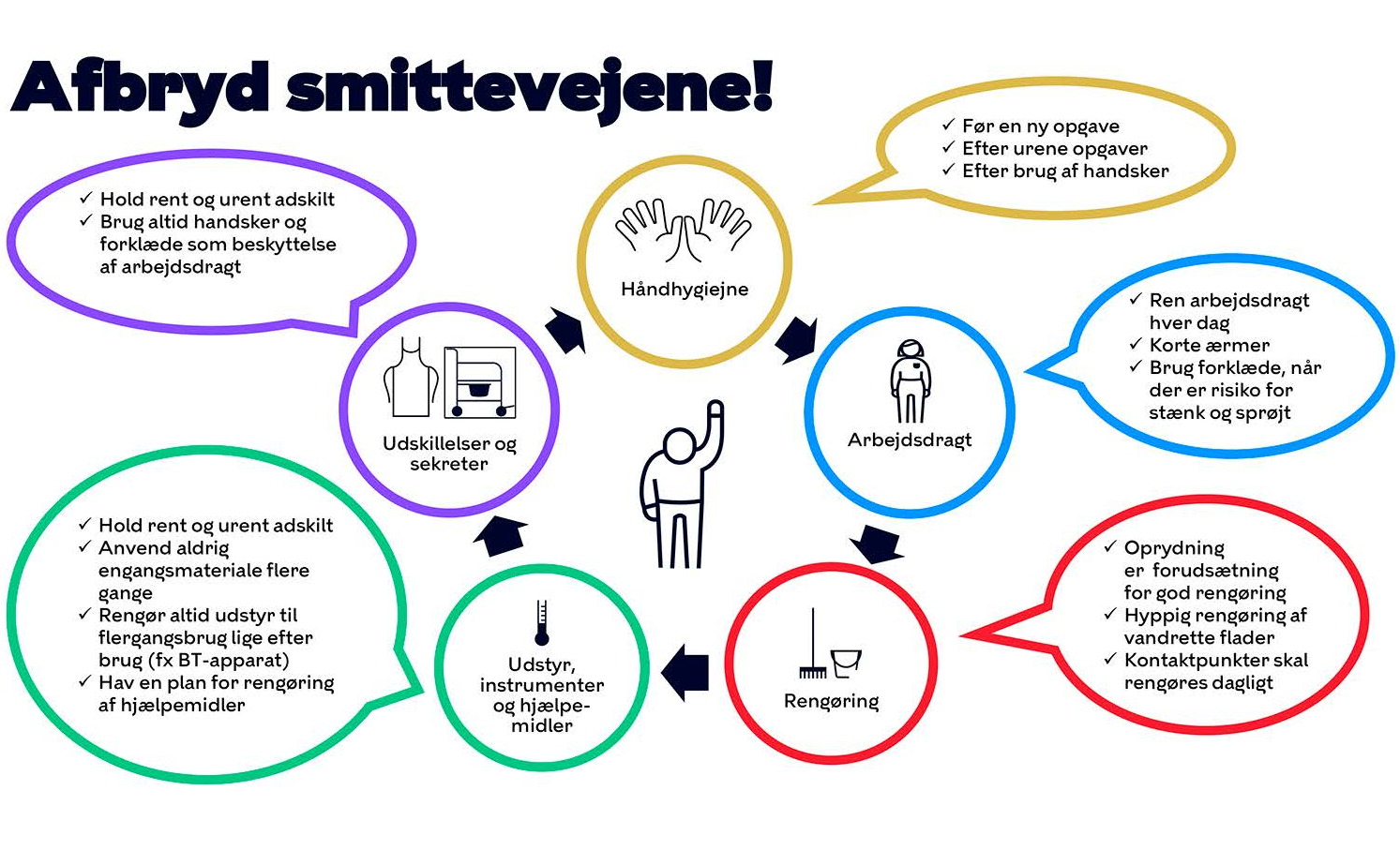 Denne plakat fungerer som en påmindelse om, hvor afgørende korrekt hygiejne og infektionsforebyggelse er for os alle. Den opfordrer både sundhedspersonale og borgere til at implementere enkle, men effektive tiltag – såsom grundig håndhygiejne, korrekt brug af værnemidler og regelmæssig rengøring – for at sikre, at vi sammen kan bryde smittevejene og skabe en sikrere og sundere hverdag.