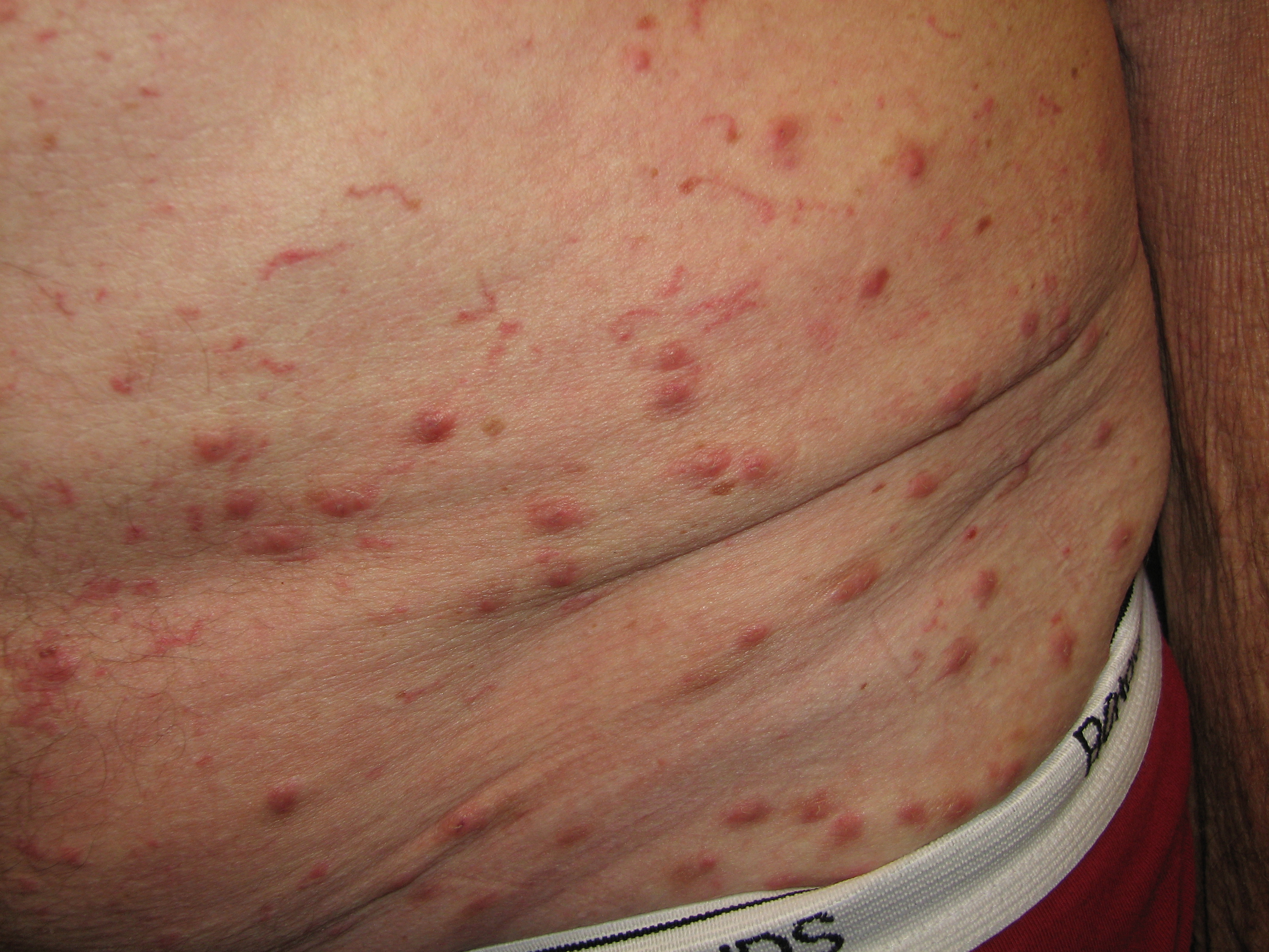 - udslæt med små vabler. Udslættet ses især i den tynde hud mellem fingrene og på fingre, ved håndled, albuer, bryst og i skridtet.