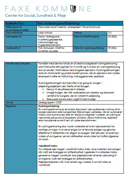 Formålet med denne instruks er at beskrive begrebet rydningserklæring samt fastsætte retningslinjer for, hvornår og hvordan en rydningserklæring skal anvendes i forbindelse med borgeres ejendom.