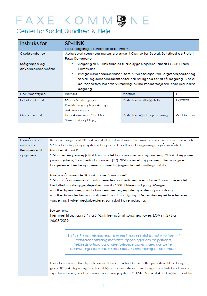 SP-Link må anvendes af autoriserede sundhedspersoner, i Faxe Kommune er det besluttet at alle sygeplejersker ansat i CSSP tildeles adgang. Øvrige sundhedspersoner, som fx fysioterapeuter, ergoterapeuter og social- og sundhedsassistenter har mulighed for at få adgang. Det er de respektive lederes vurdering, hvilke medarbejdere, som skal have adgang.