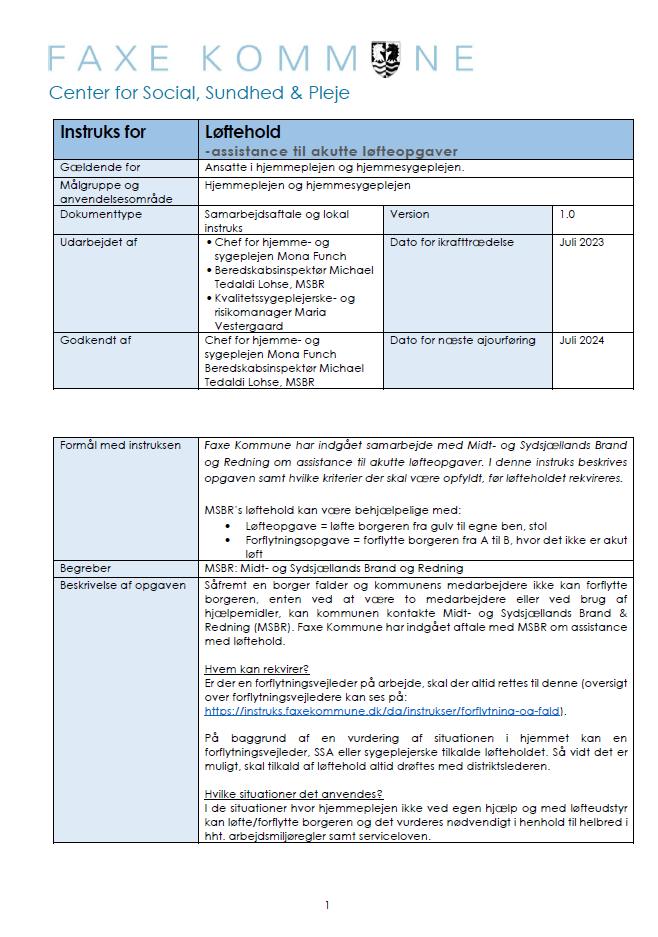 Faxe Kommune har indgået samarbejde med Midt- og Sydsjællands Brand og Redning om assistance til akutte løfteopgaver. I denne instruks beskrives opgaven samt hvilke kriterier der skal være opfyldt, før løfteholdet rekvireres. MSBR’s løftehold kan være behjælpelige med: