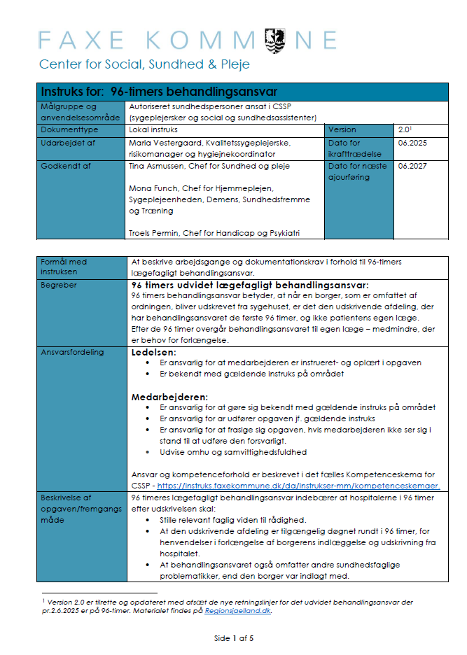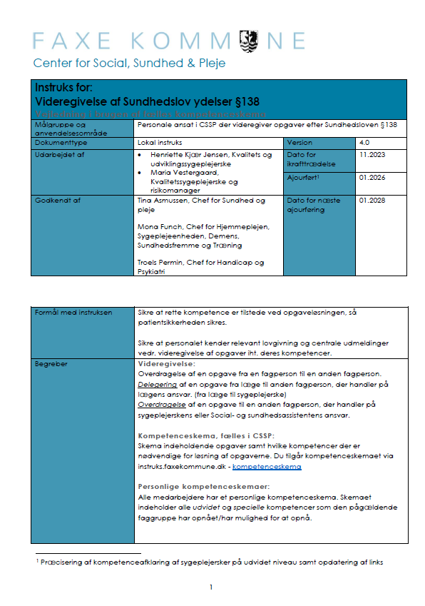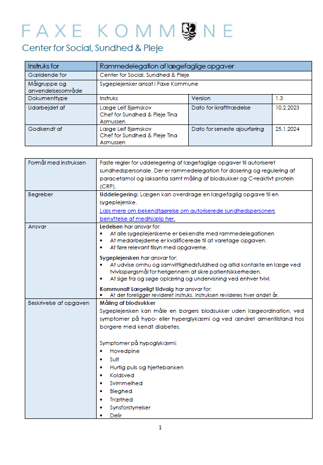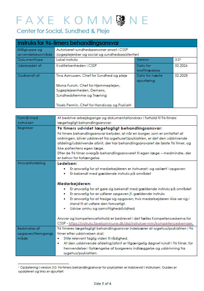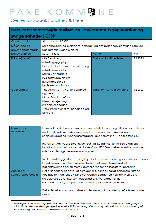 Formålet med denne instruks er at sikre et struktureret og effektivt samarbejde mellem de udekørende sygeplejersker og øvrige enheder på både Socialområdet og Sundhedsområdet i Faxe Kommune – i daglig tale CSSP.