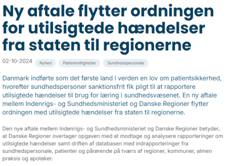 Det store arbejde med patientsikkerhed fortsætter, nu i regionalt regi. Fra sommeren 2025 overgår arbejdet med utilsigtede hændelser til Regionerne. Læs mere her:
