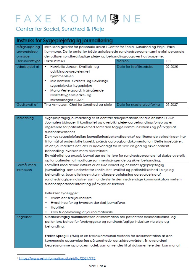 Sygeplejefaglig journalføring er et centralt arbejdsredskab for alle ansatte i CSSP. Journalen bidrager til kontinuitet og overblik i pleje- og behandlingsforløb og er afgørende for patientsikkerhed samt den faglige kommunikation i og på tværs af sundhedsvæsenet. Den nye sygeplejefaglige journalføringsbekendtgørelse1 og tilhørende vejledninger, har til formål at understøtte korrekt, præcis og brugbar dokumentation. Dette indebærer, at der journalføres det, der er nødvendigt for at sikre en god og sikker patient-behandling, hverken mere eller mindre. En målrettet og præcis journal gør det lettere for sundhedspersonalet at skabe overblik og for patienten at modtage sammenhængende og sikker behandling.